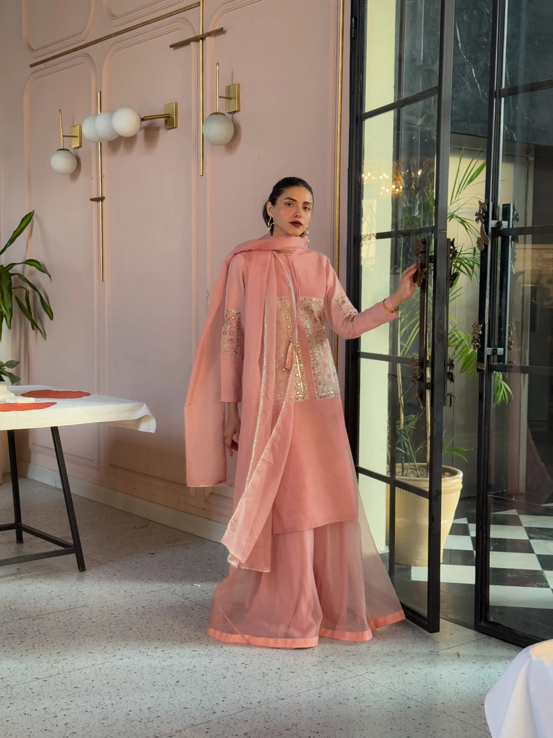 Draped in the soft hues of onion pink, this intricately embroidered ensemble tells a story of timeless beauty. Featuring a gracefully flowing sharara paired with a delicate lawn silk shirt and a refined organza dupatta, Afsana is the epitome of elegance and charm—perfect for a dreamy Eid celebration.