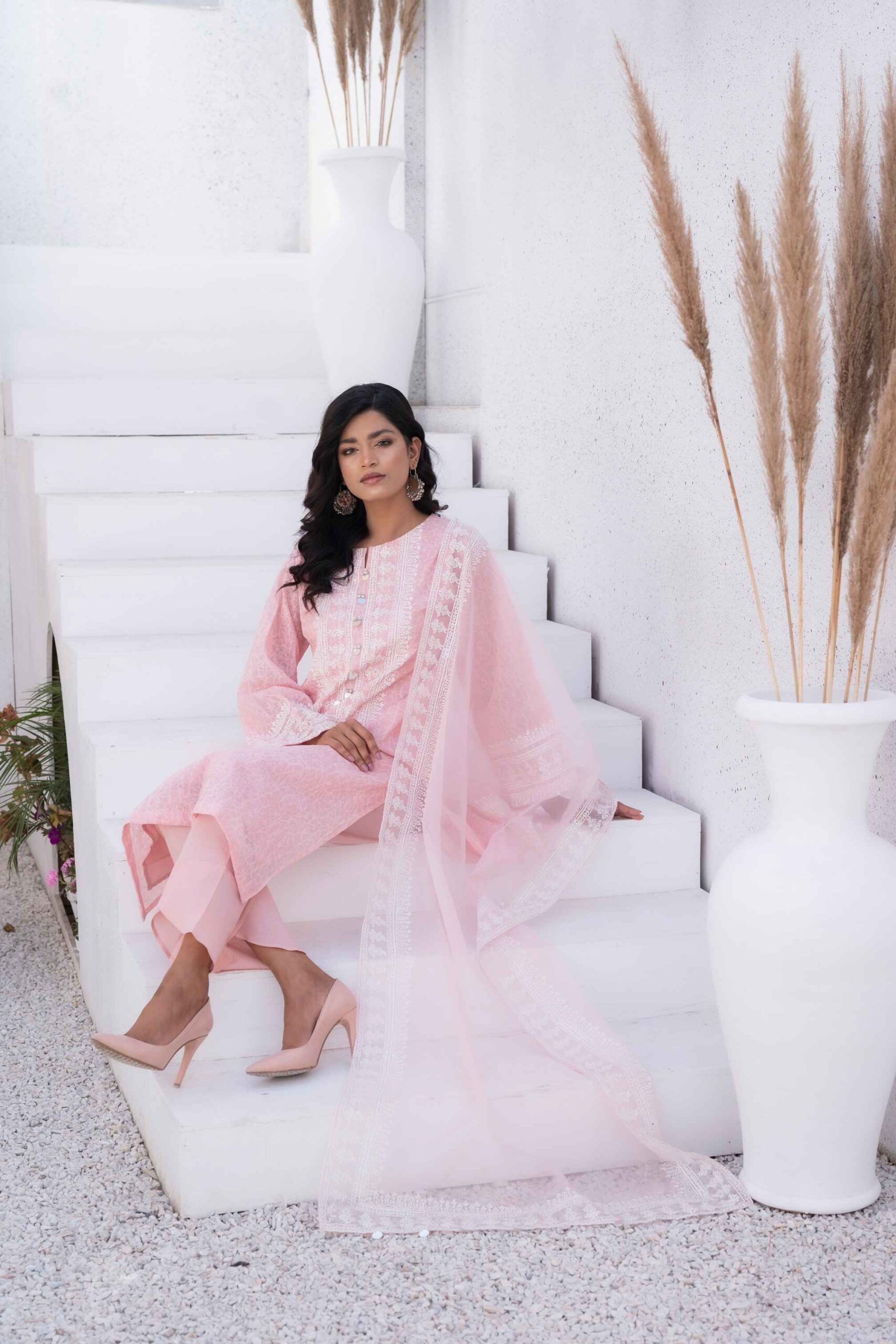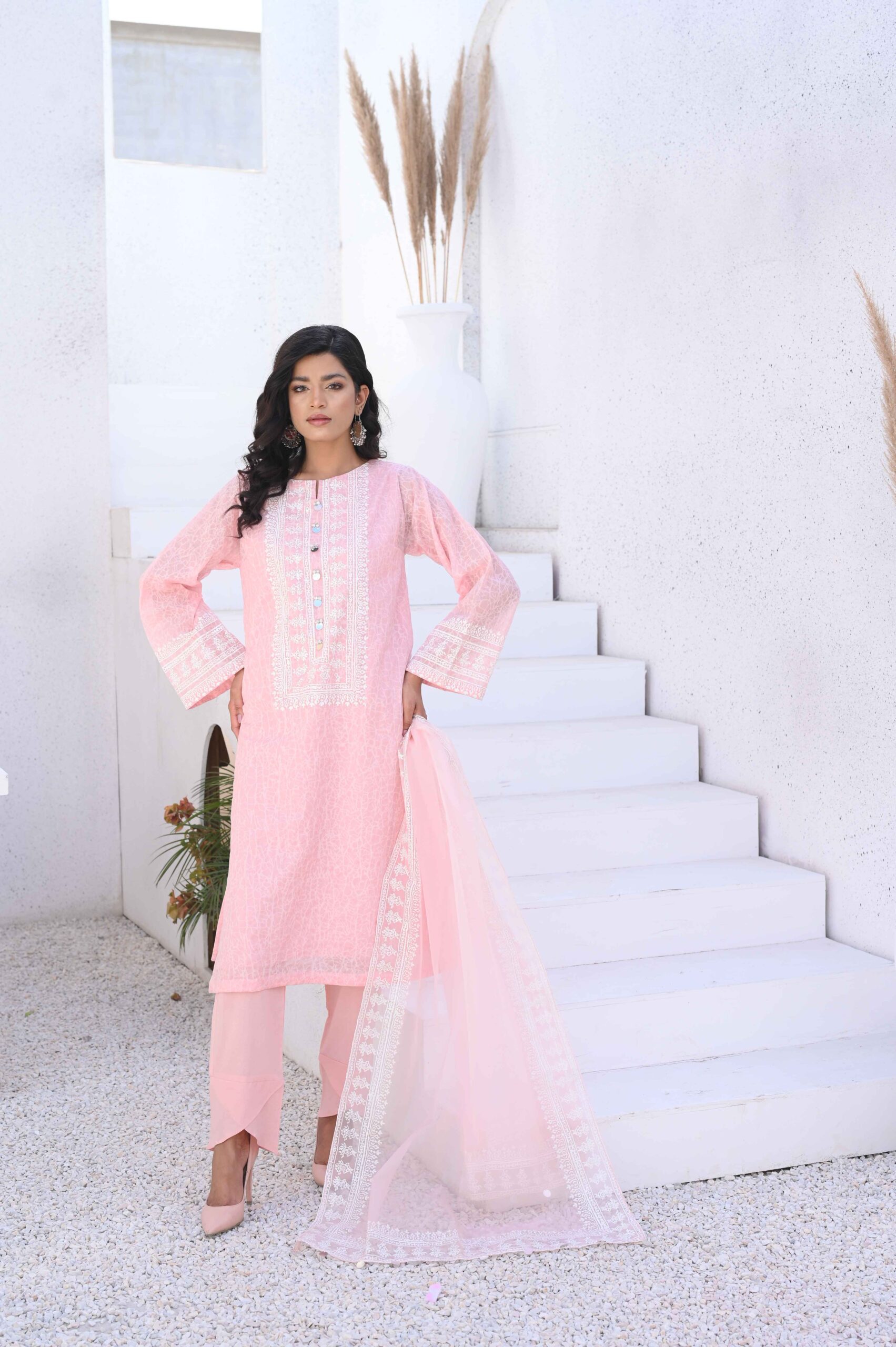 - Included: 3-piece set – straight kameez, capri, and dupatta