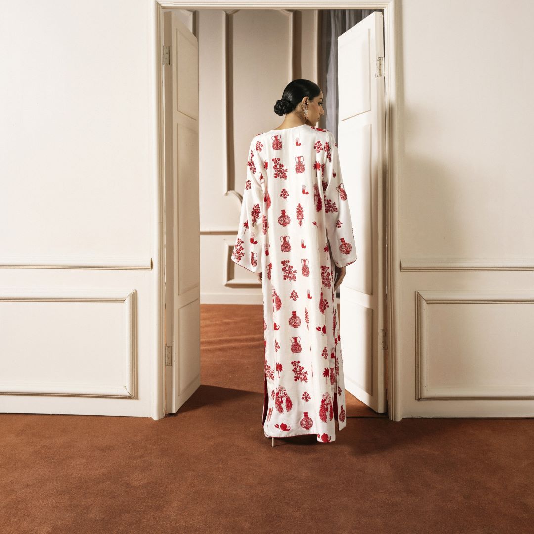 Crimson Royale is a statement of refined festive luxury. Crafted in pure tassal silk, this ivory kaftan is adorned with hand-painted screen print motifs, elevated with heavy hand embellishment across the neckline and front.