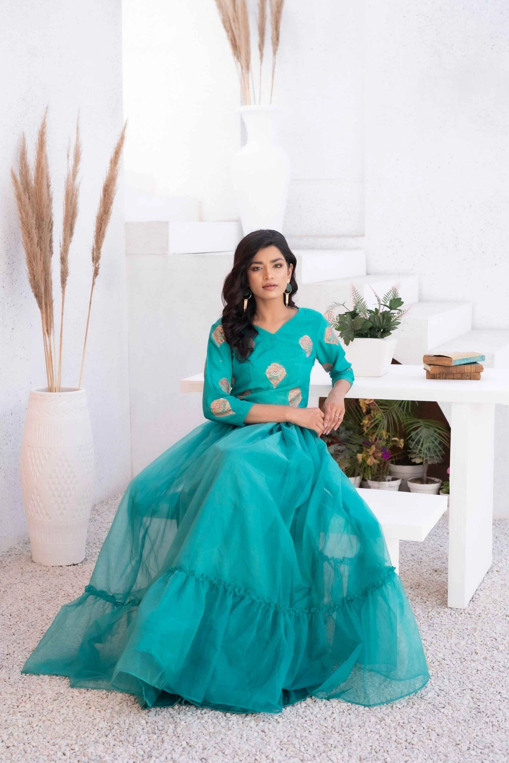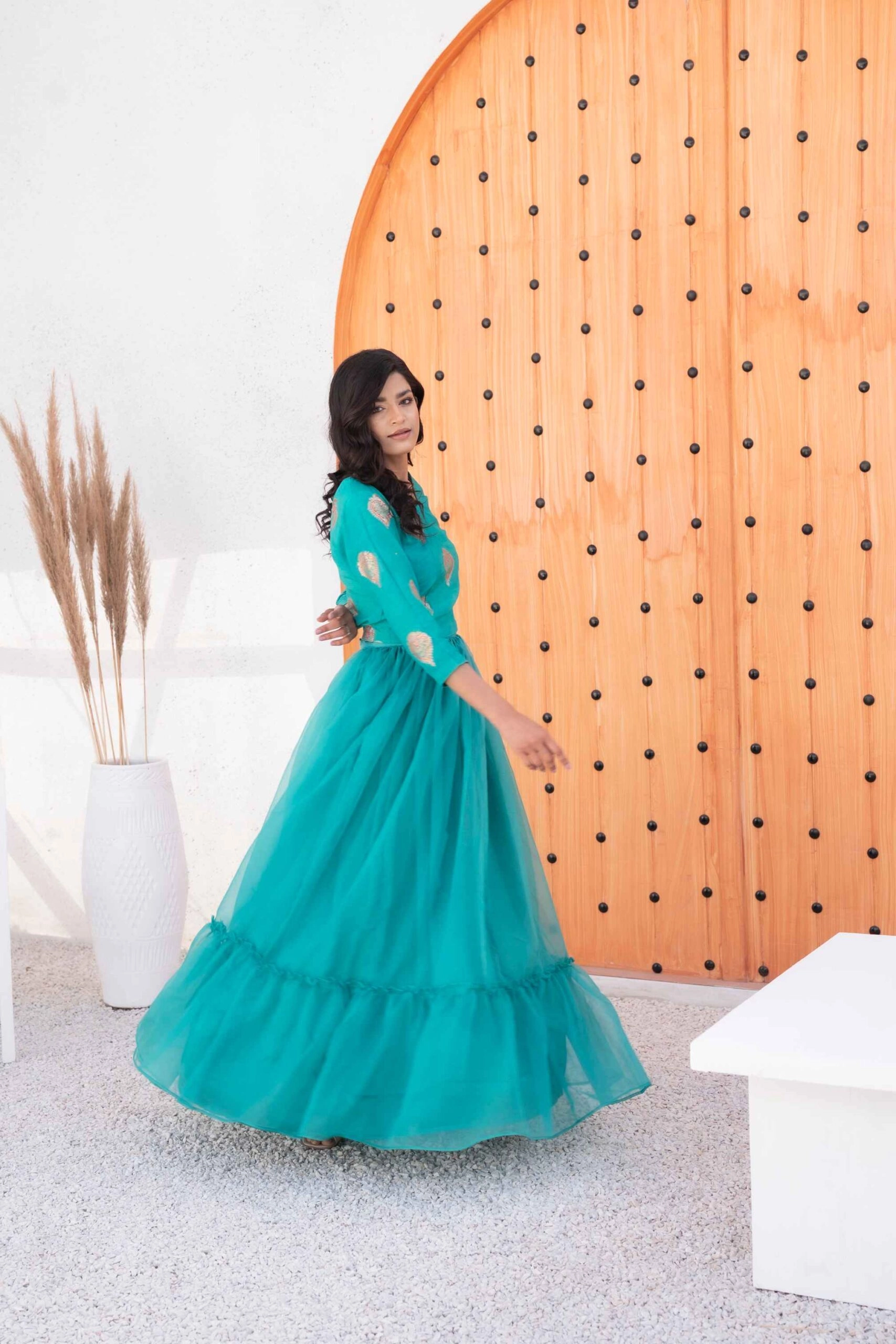 - Skirt: Paired with an organza skirt for an elegant look