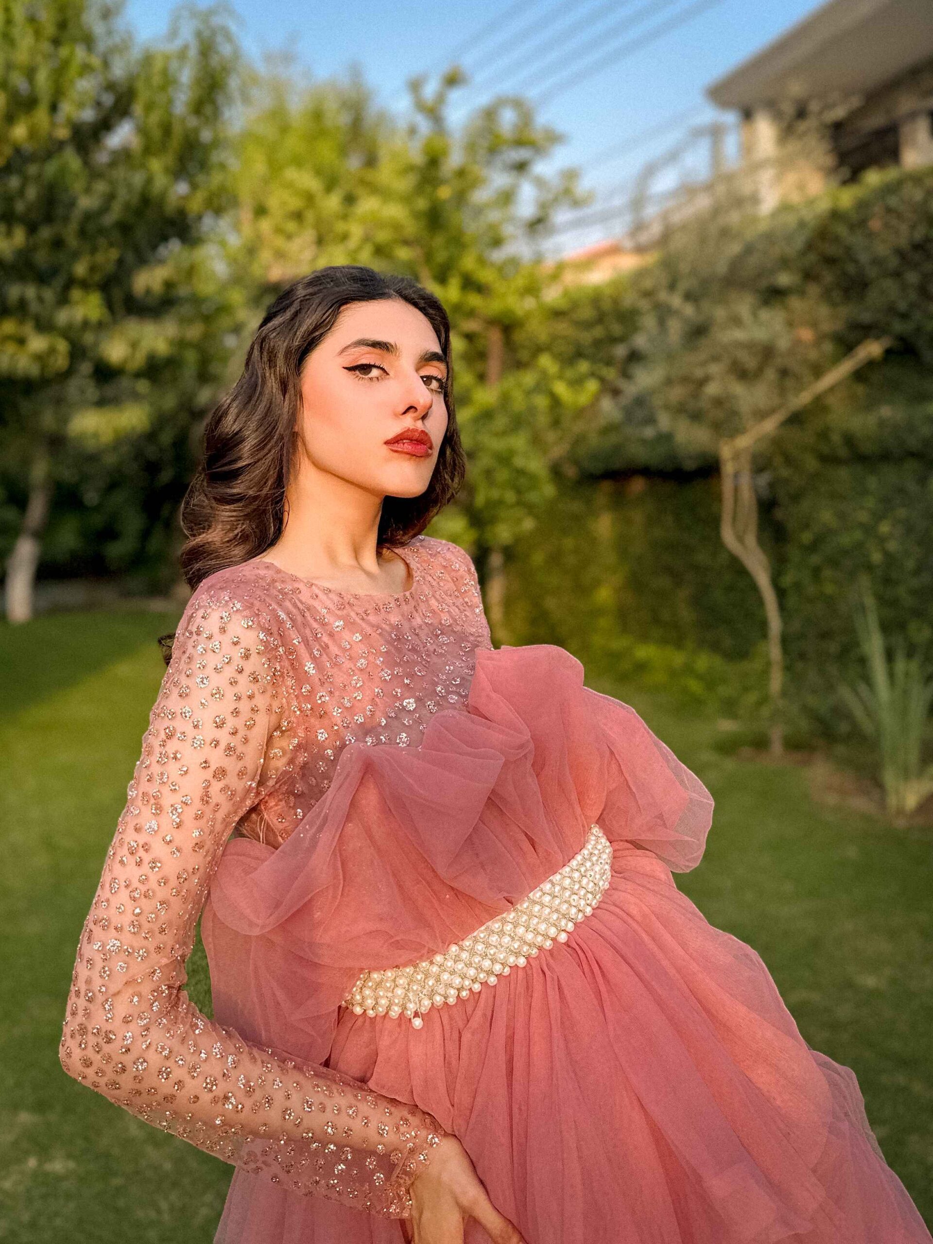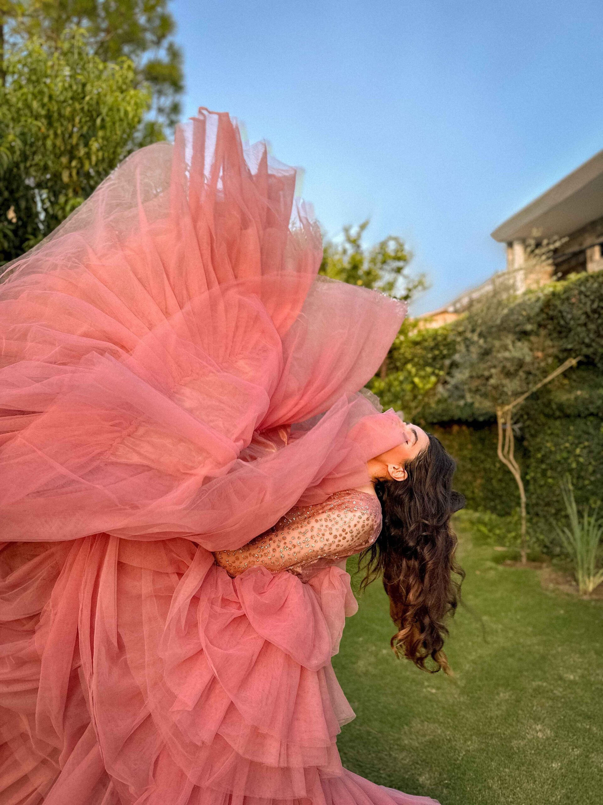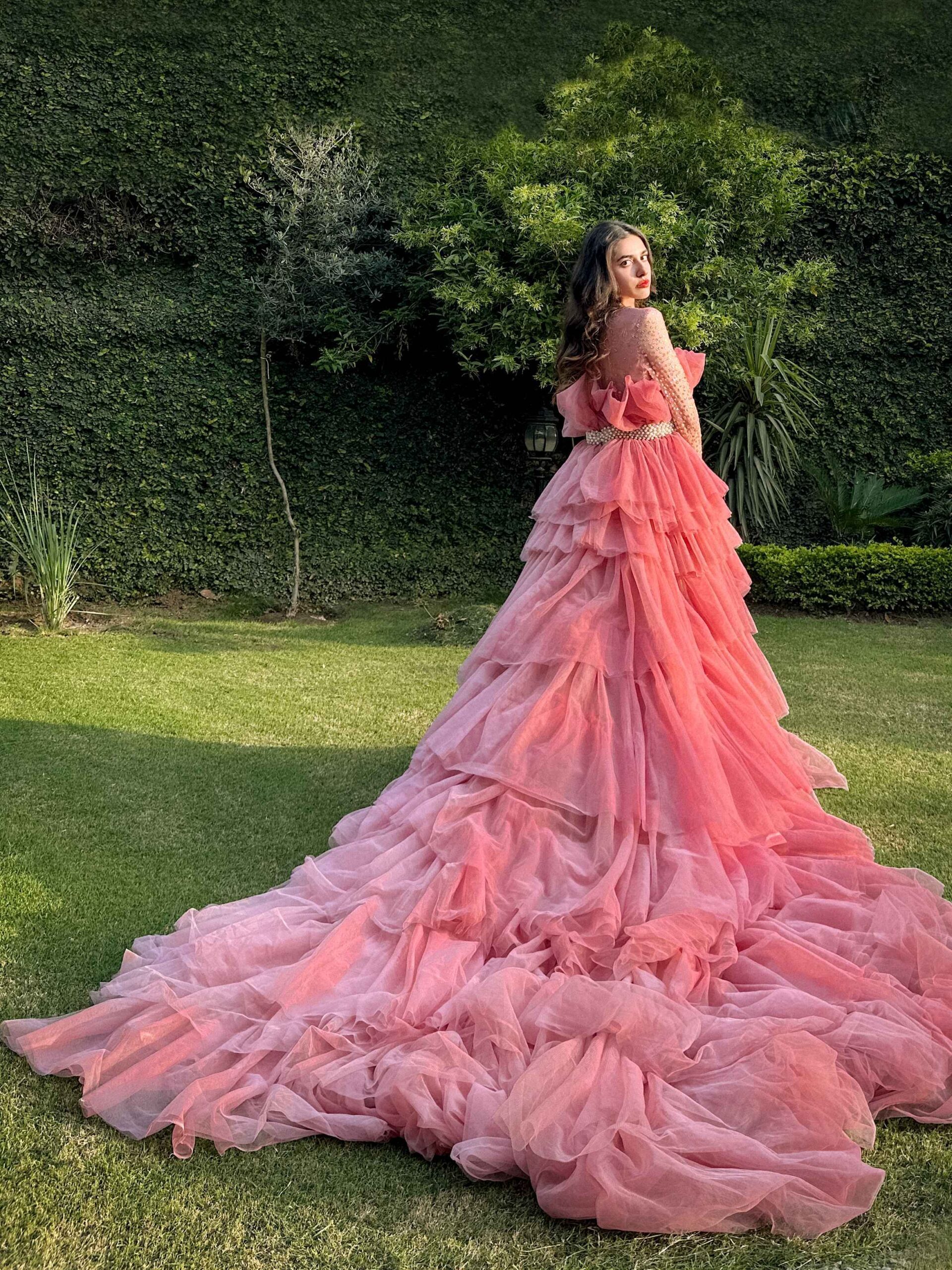 - Design: Long tail dress with cascading heavy net frills, evoking a fairy tale allure