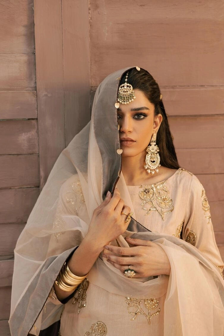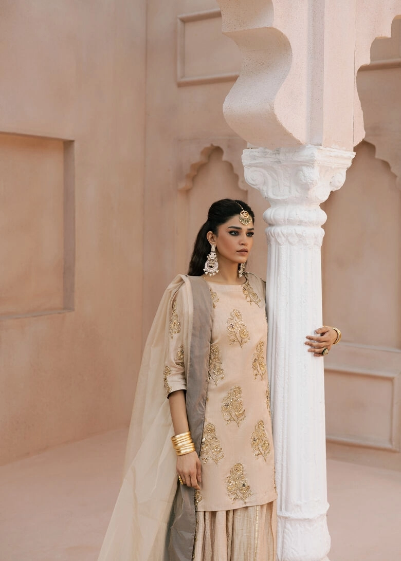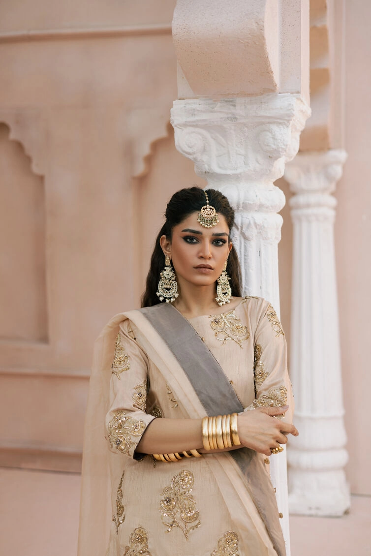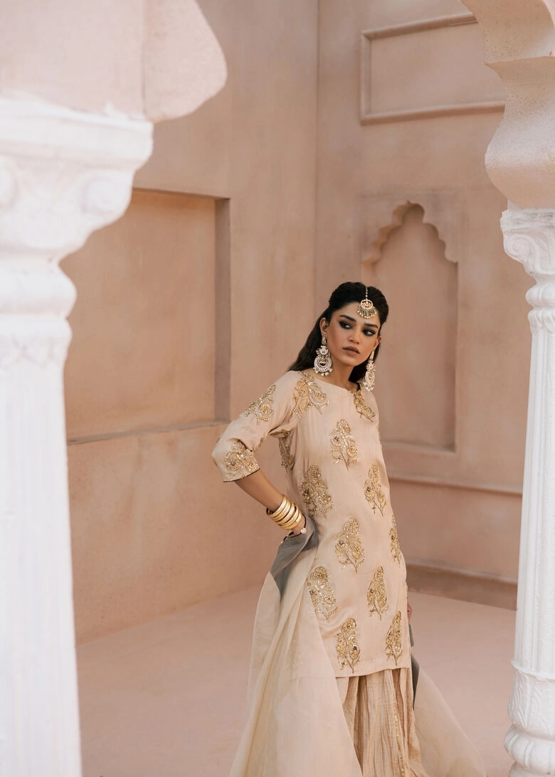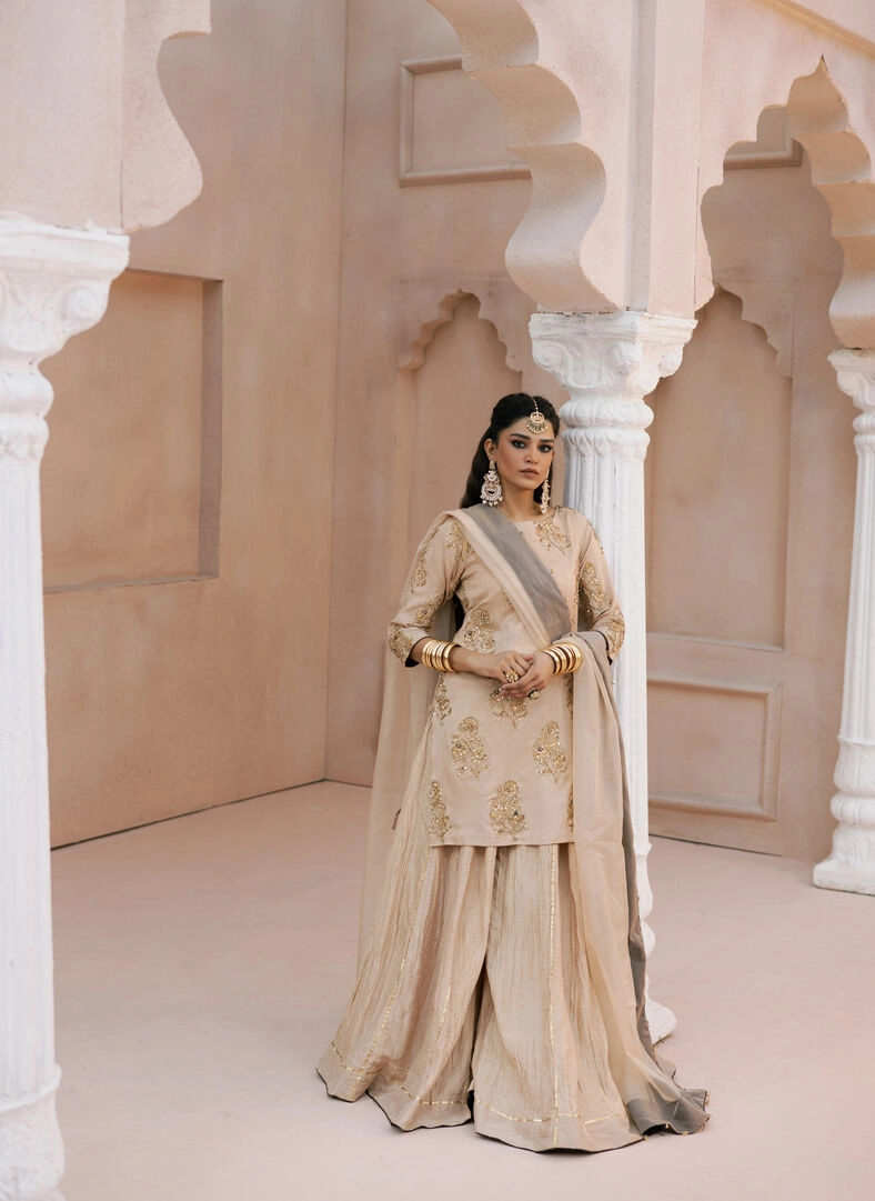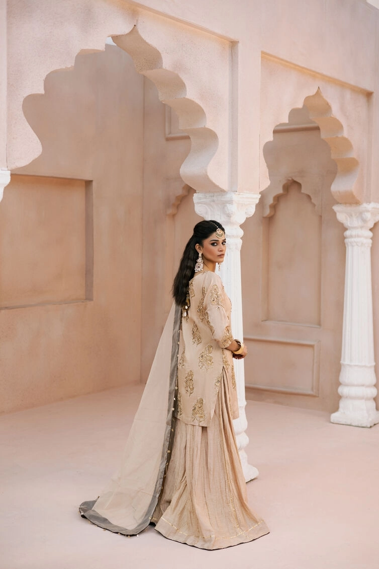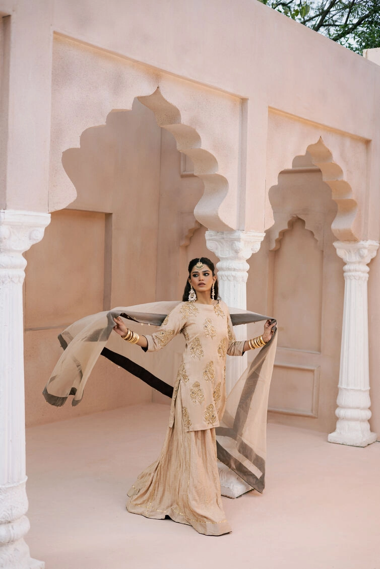 Introducing the Golden Aura—a luxurious raw silk shirt adorned with intricate gold embellishments, perfectly paired with a crushed gotta flowy sharara for an effortlessly regal look. Complemented by an organza dupatta with elegant patches, this masterpiece is a part of something truly special coming your way.