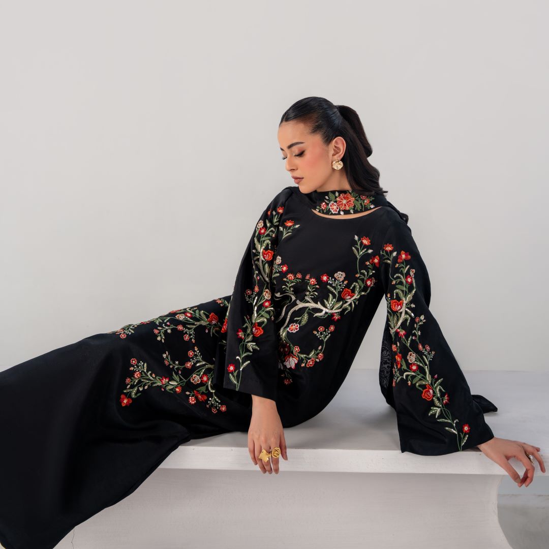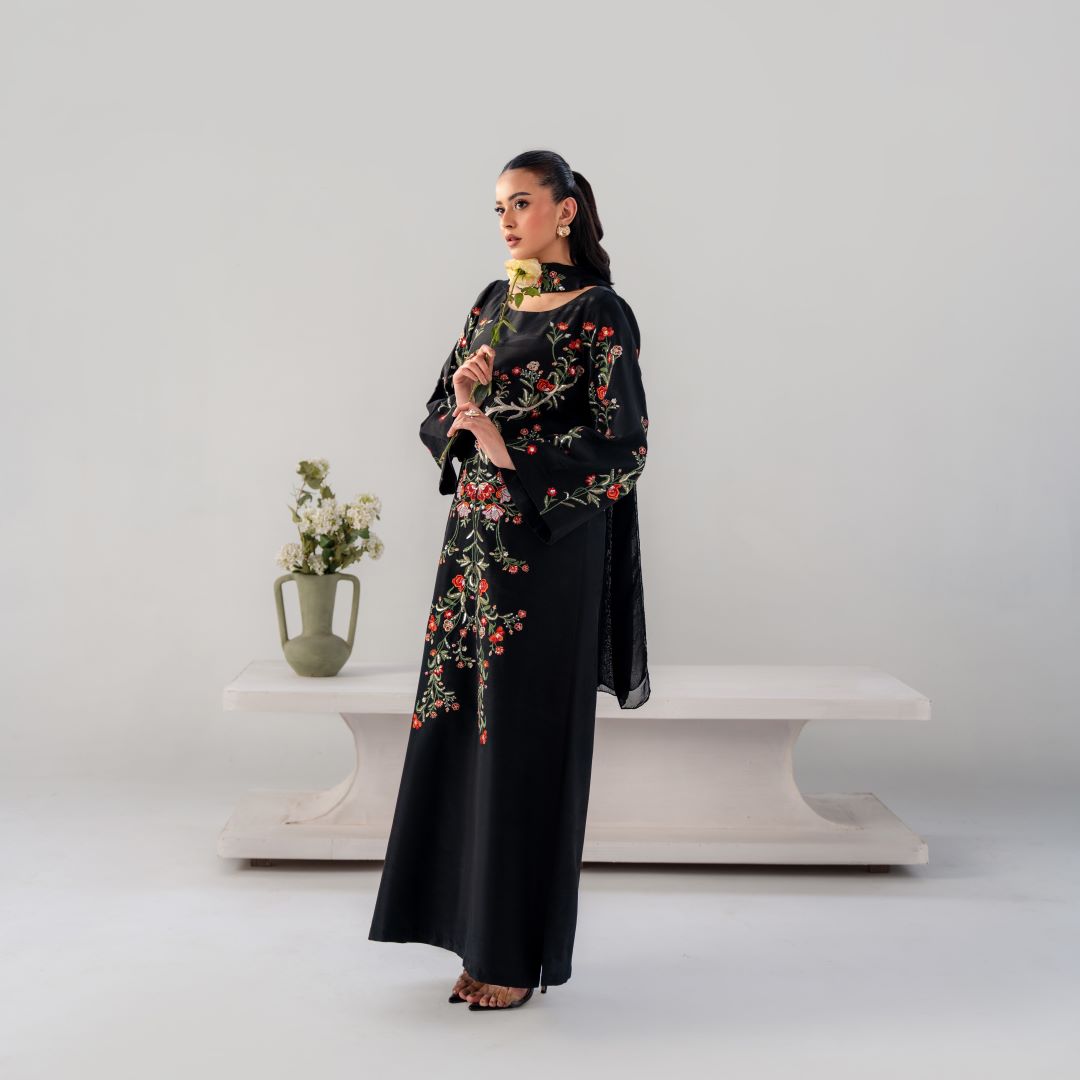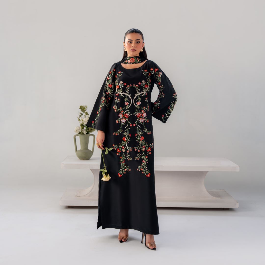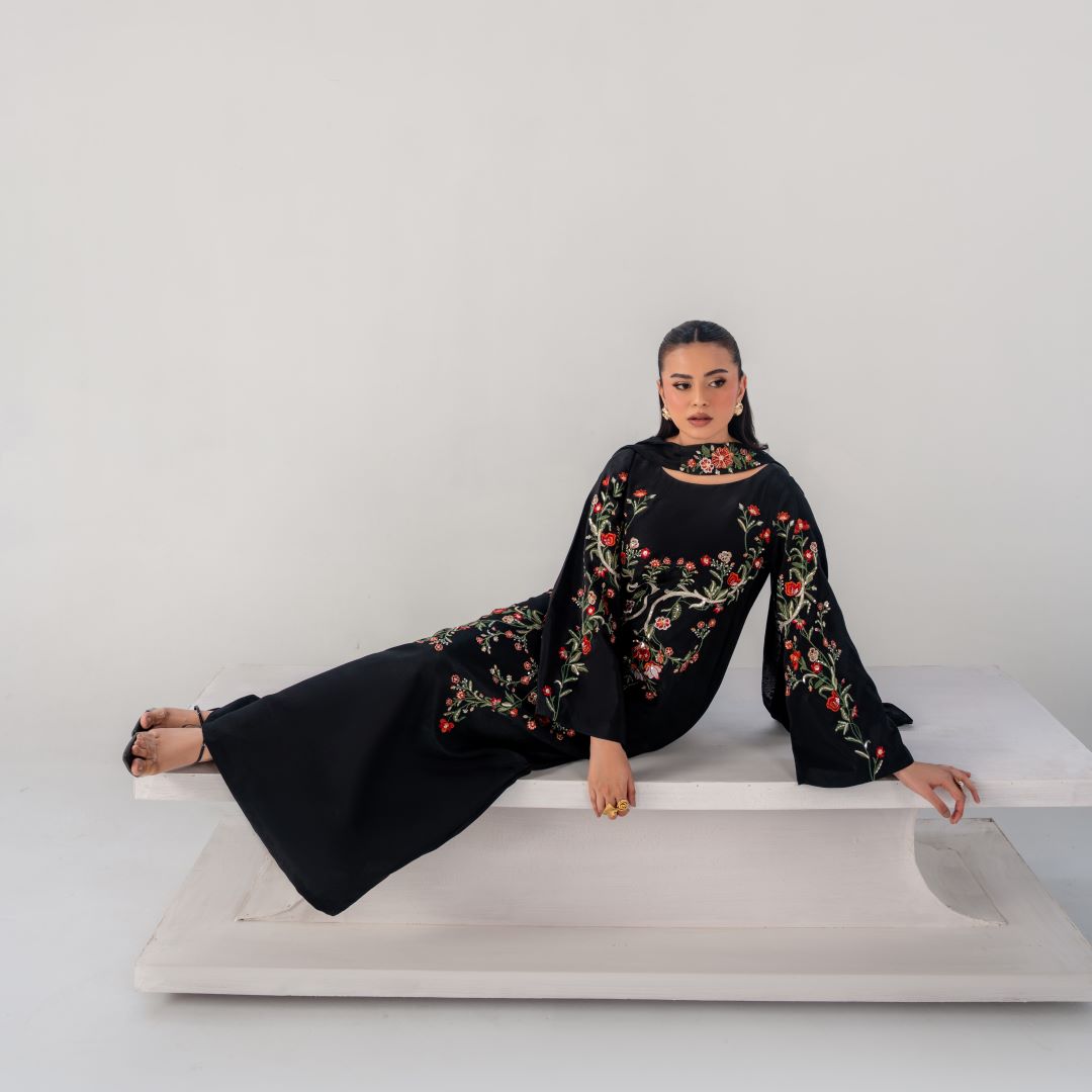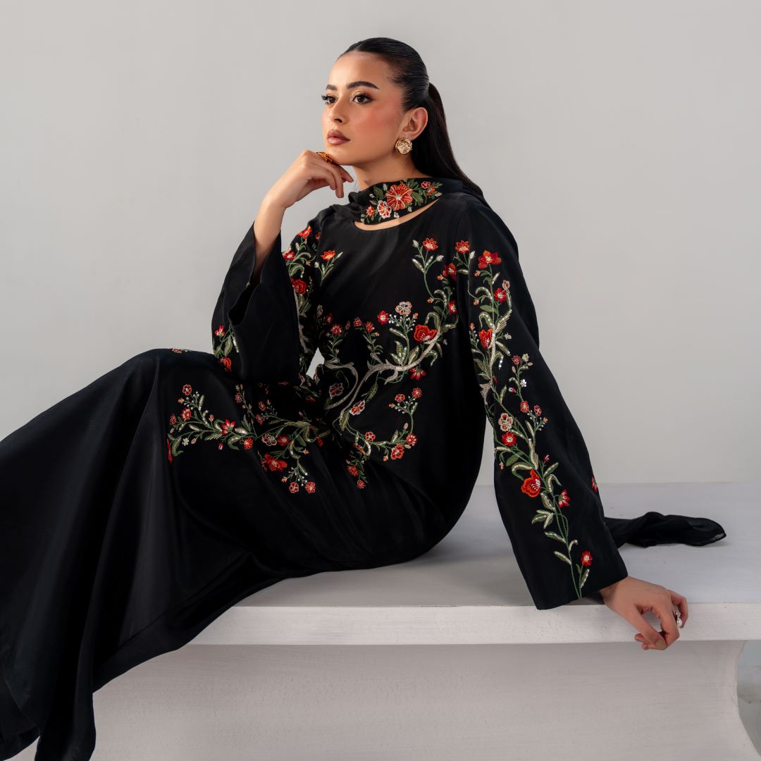 Gulnaar is a timeless black ensemble elevated with intricate multi-tone floral embroidery, thoughtfully placed to create a statement of refined elegance.