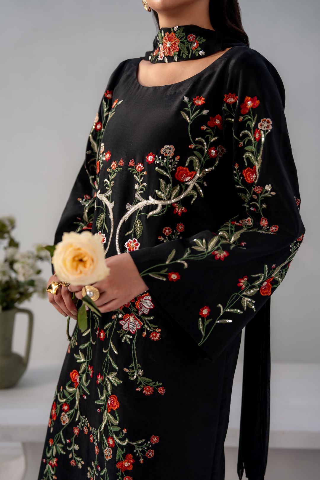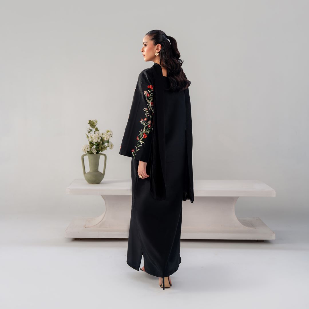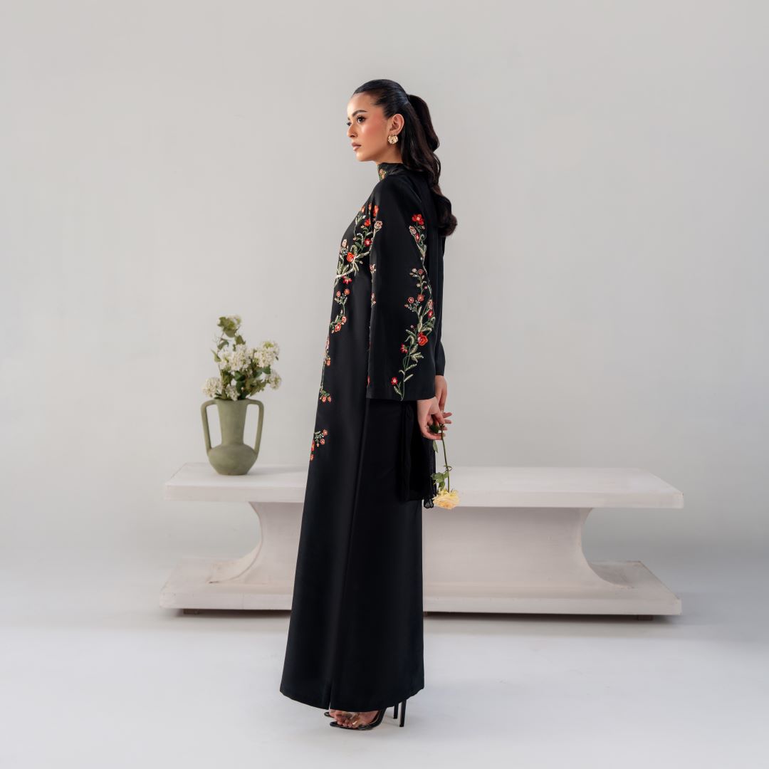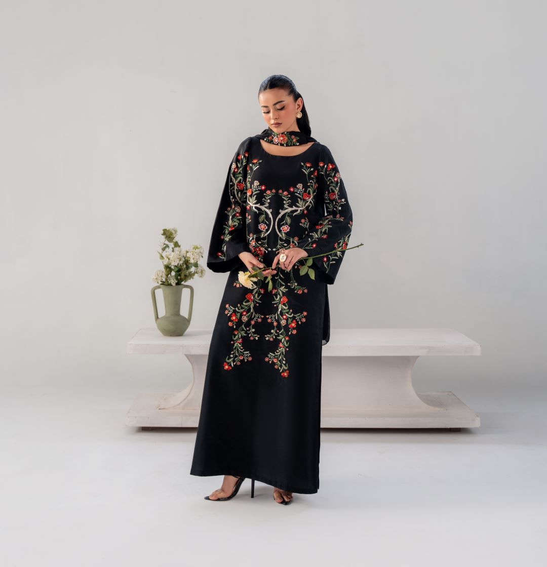 Gulnaar is a timeless black ensemble elevated with intricate multi-tone floral embroidery, thoughtfully placed to create a statement of refined elegance.