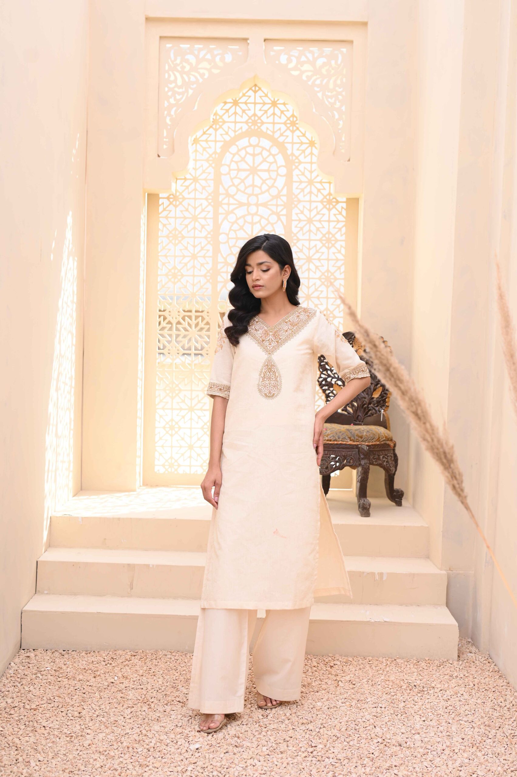 • Shirt: Khadi cotton with floral self-print and intricate embroidery in shades of copper, nude, and sequins. Sleeves feature gold block print motifs and an embroidered border.
