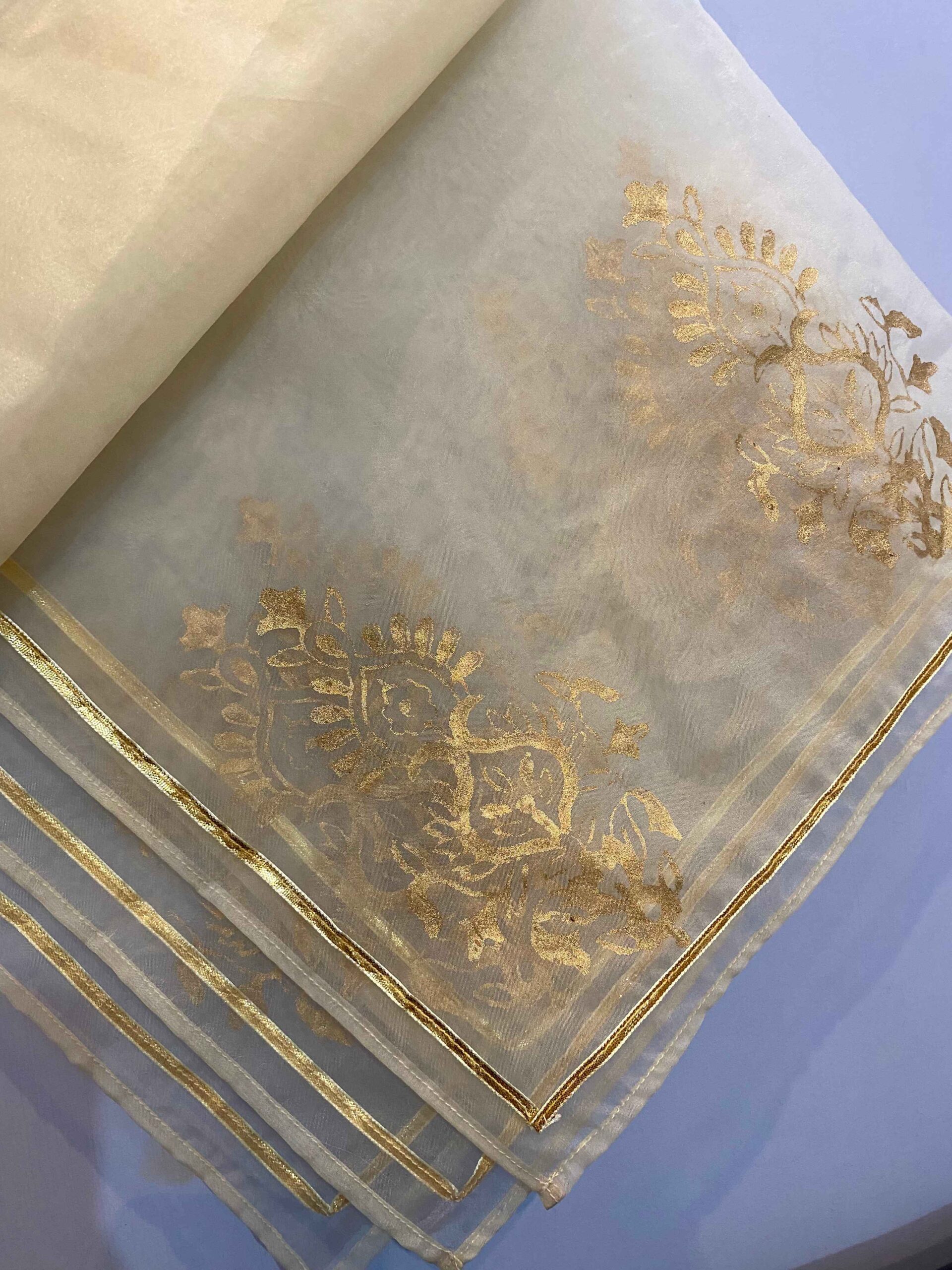 • Dupatta: Finished with gotta lace and block print motifs, adding a refined touch.
