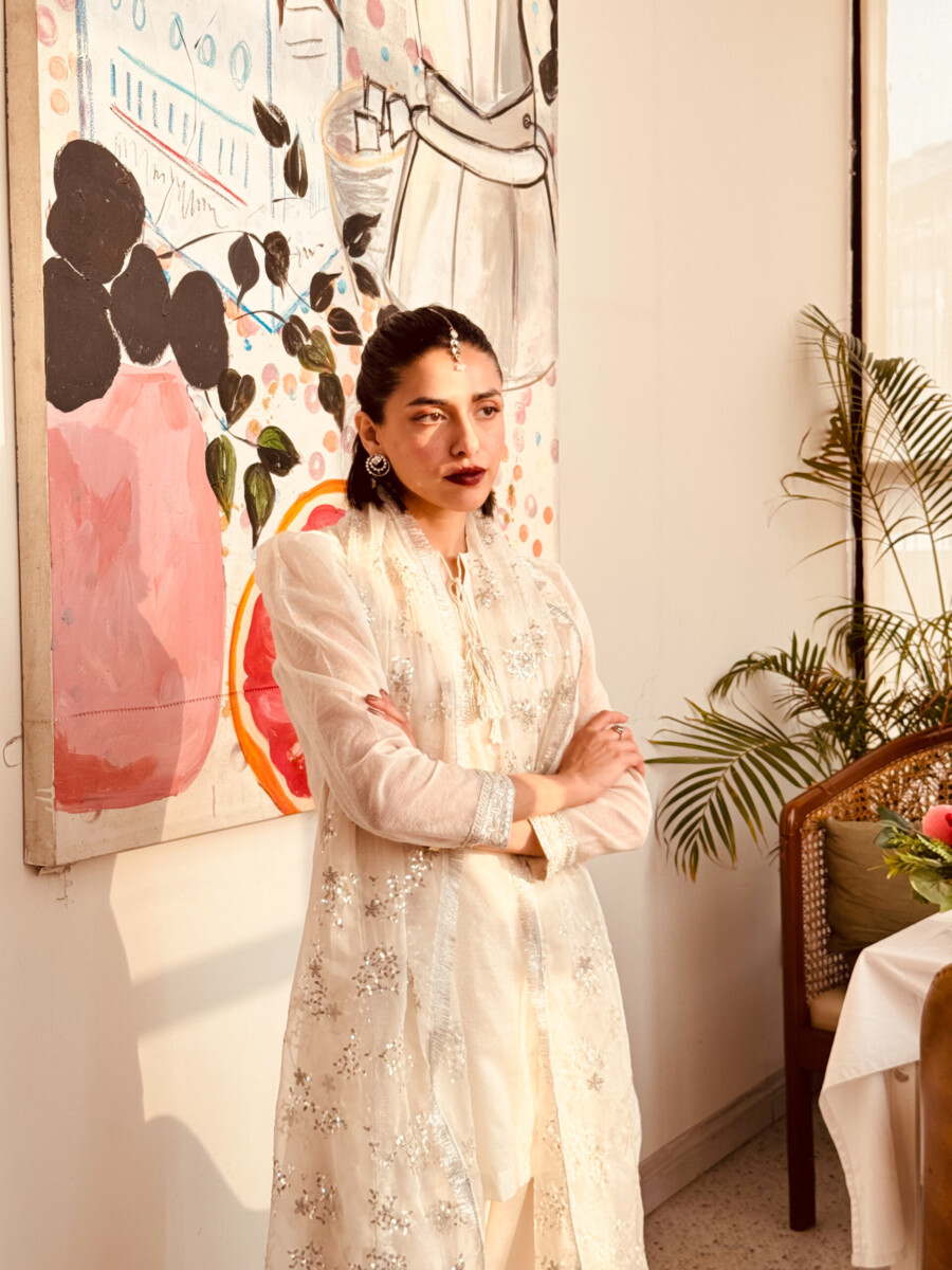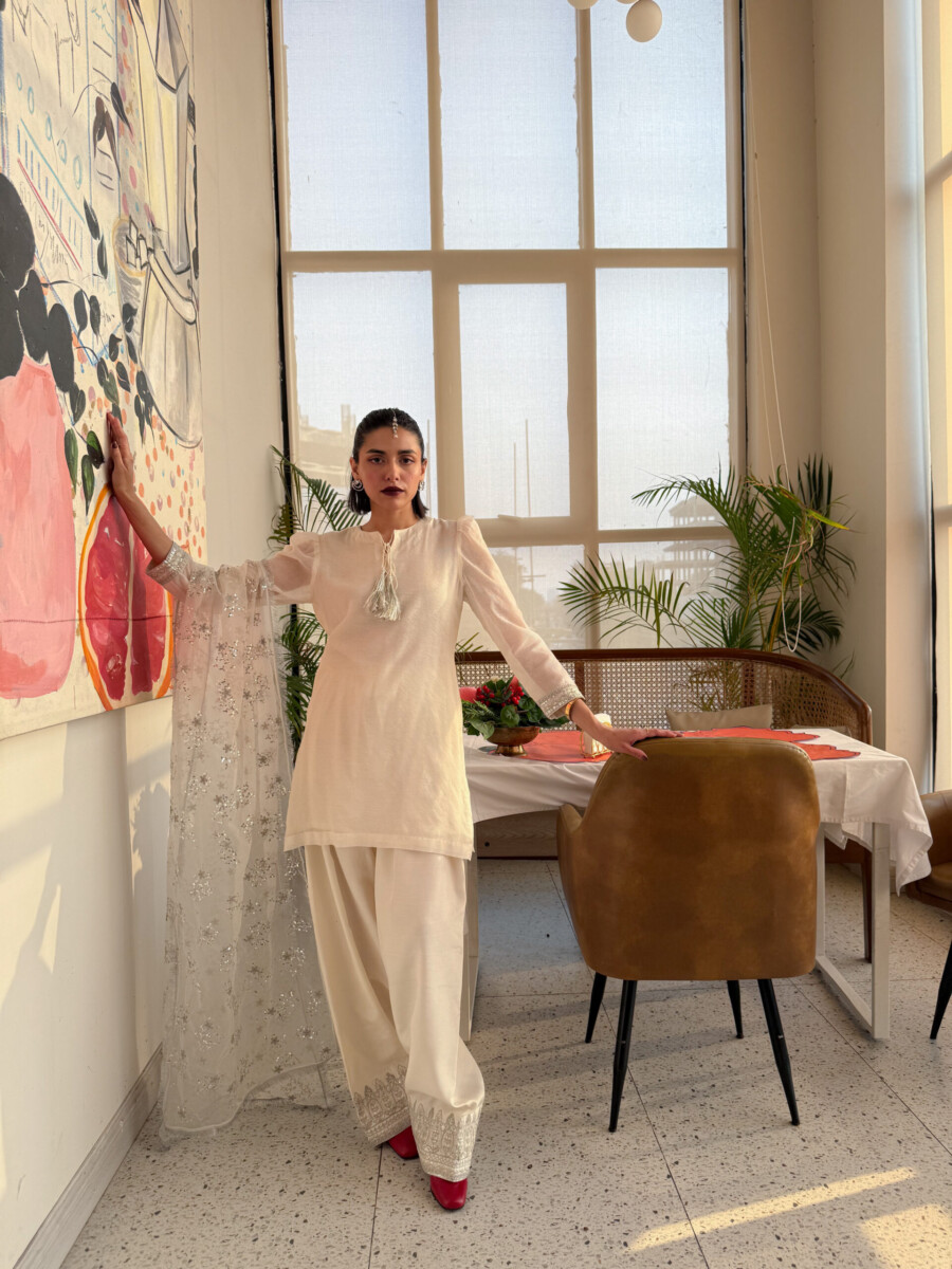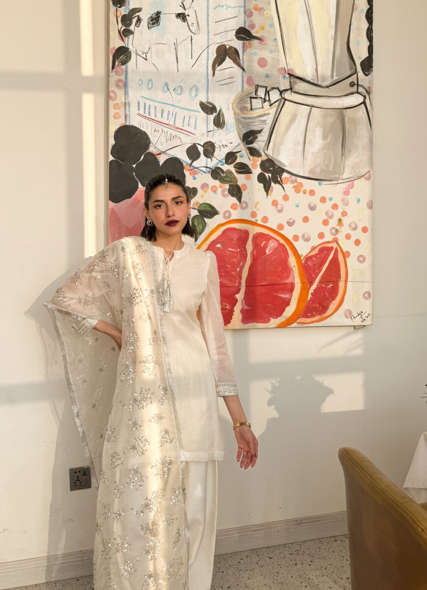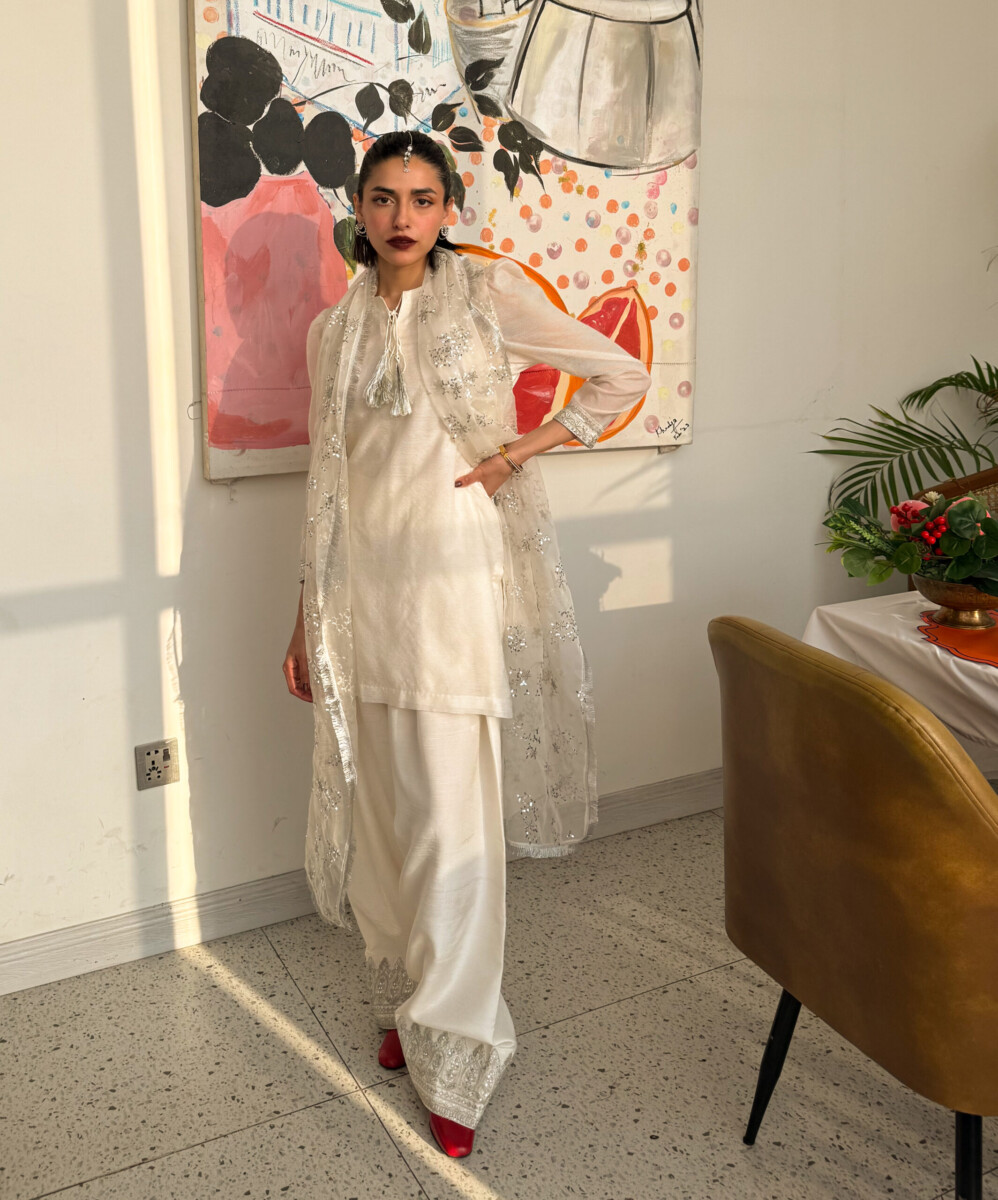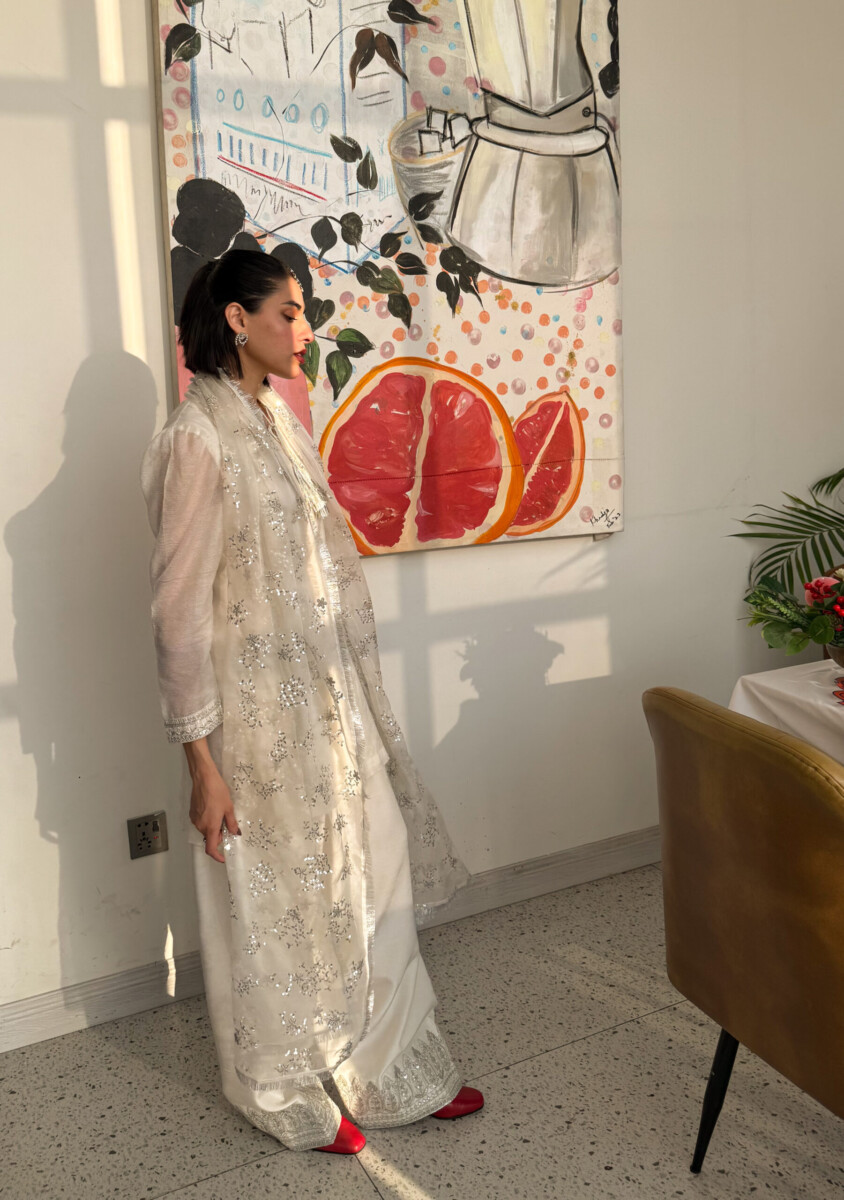The Farshi Shalwar is making a grand comeback! This timeless silhouette is reimagined with a beautifully embroidered white kameez, exuding effortless elegance. The statement Farshi Shalwar is adorned with heavy embroidery at the bottom, bringing a regal charm to the look. Paired with a delicately embroidered organza stole, this ensemble strikes the perfect balance between heritage and modern sophistication. Every intricate detail is a tribute to timeless craftsmanship, making it the perfect choice for a graceful and unforgettable Eid.