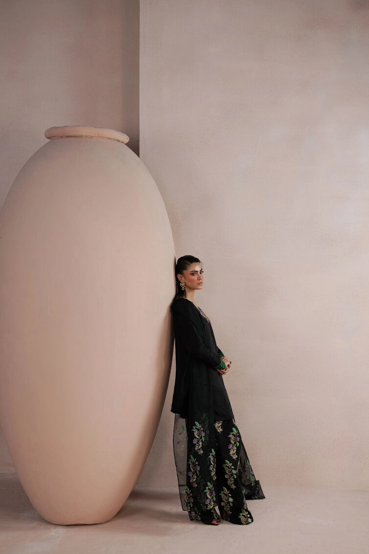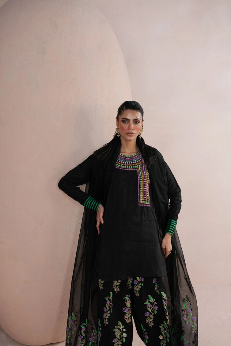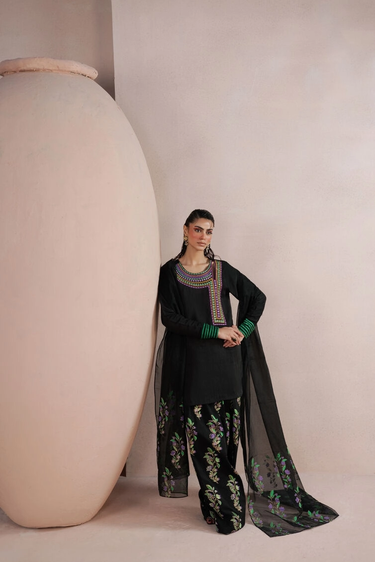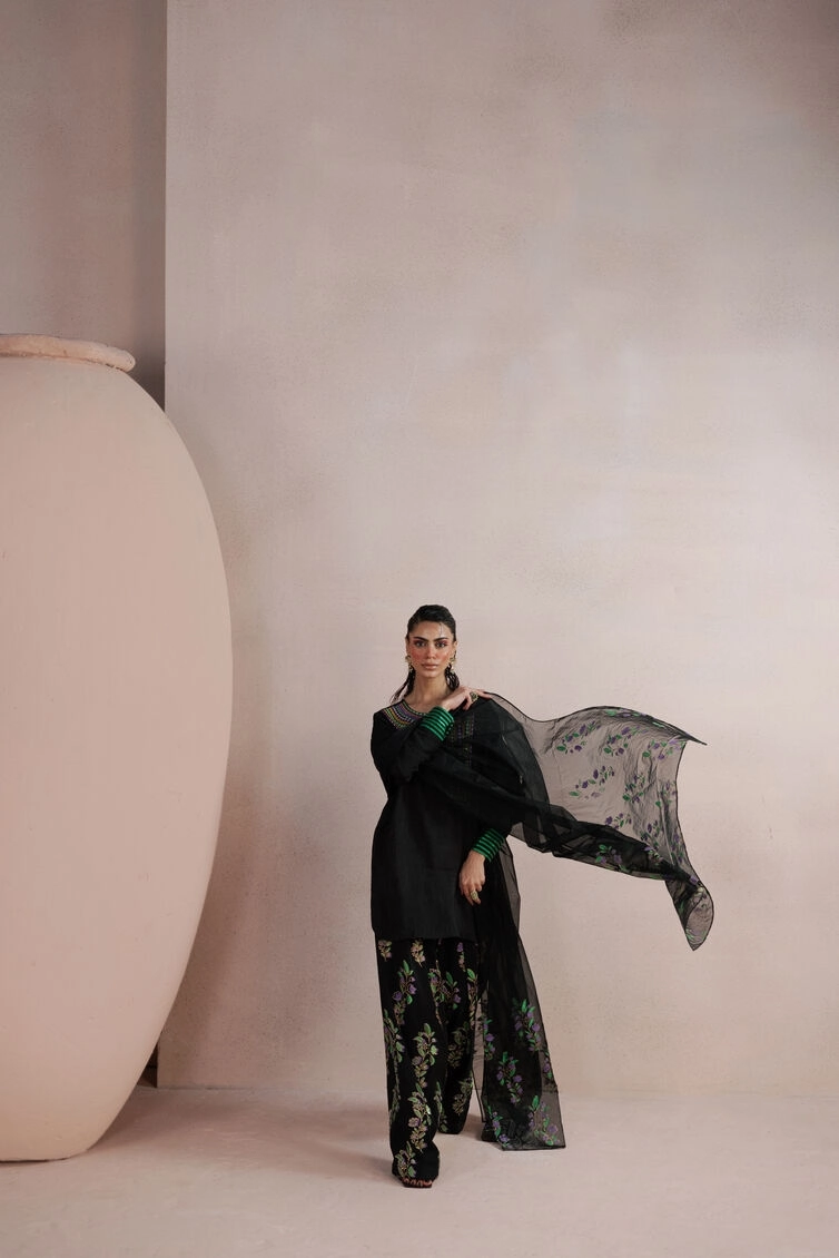 Step into a breathtaking fusion of tradition and modern elegance with Noir Blossom. This exquisite black ensemble features a finely crafted short kurti with a beautifully embellished neckline and green cuffs. The printed shalwar, adorned with vibrant floral designs and intricate hand embellishments, adds a touch of sophistication, while the sheer organza dupatta with printed borders completes the look. Designed for festive occasions and evening gatherings, Noir Blossom perfectly balances timeless charm with contemporary flair.