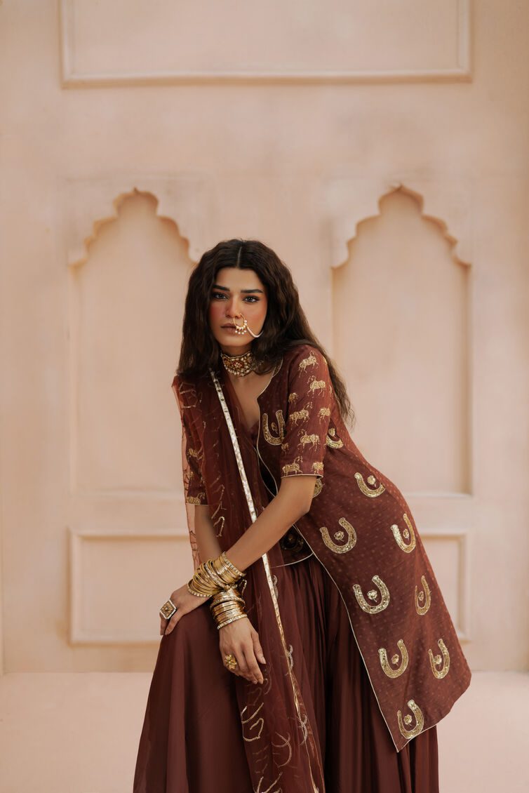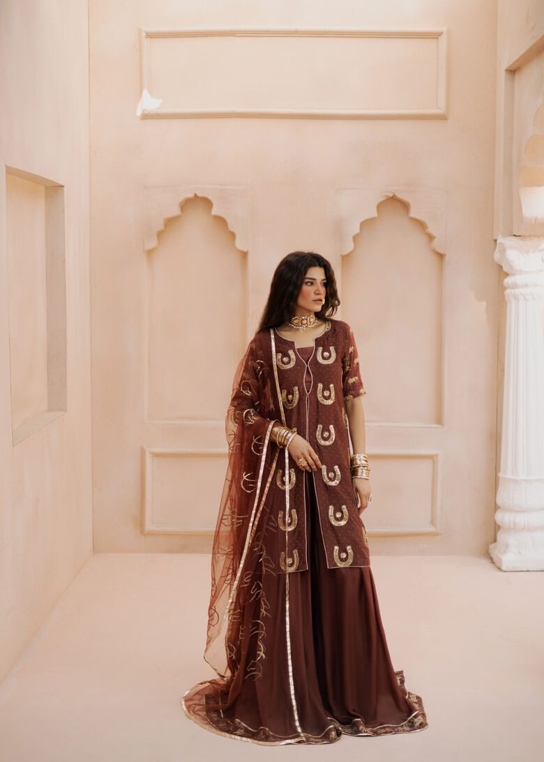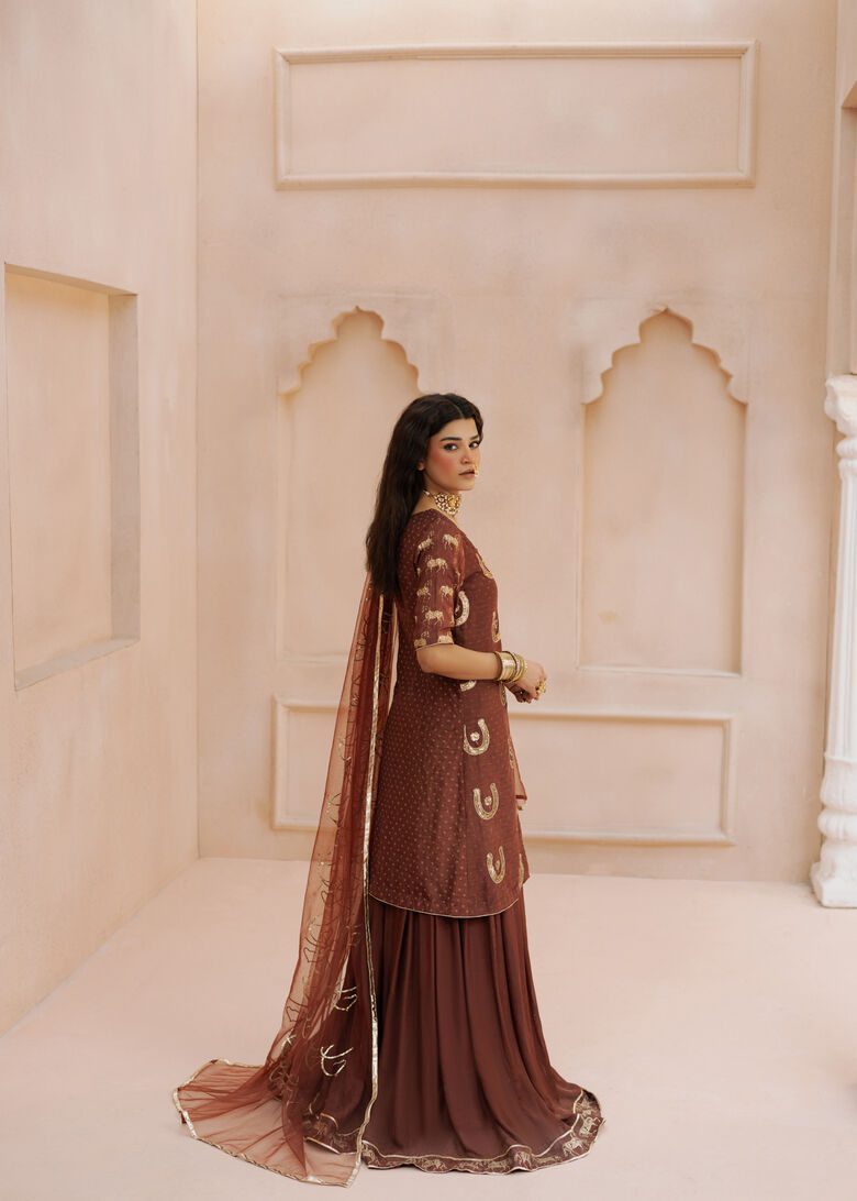 Step into timeless elegance with Royal Saddle, a luxurious dark brown ensemble crafted from premium fabrics. The self-printed raw silk shirt features intricate sequins embroidery on the front, with heavily embellished sleeves. Paired with a flowing silk sharara adorned with elegant patch detailing, a fully embroidered net dupatta, and a cotton silk blouse for added comfort and style, this outfit exudes sophistication. Designed for modern women who appreciate fine craftsmanship, Royal Saddle is the perfect choice for grand occasions.