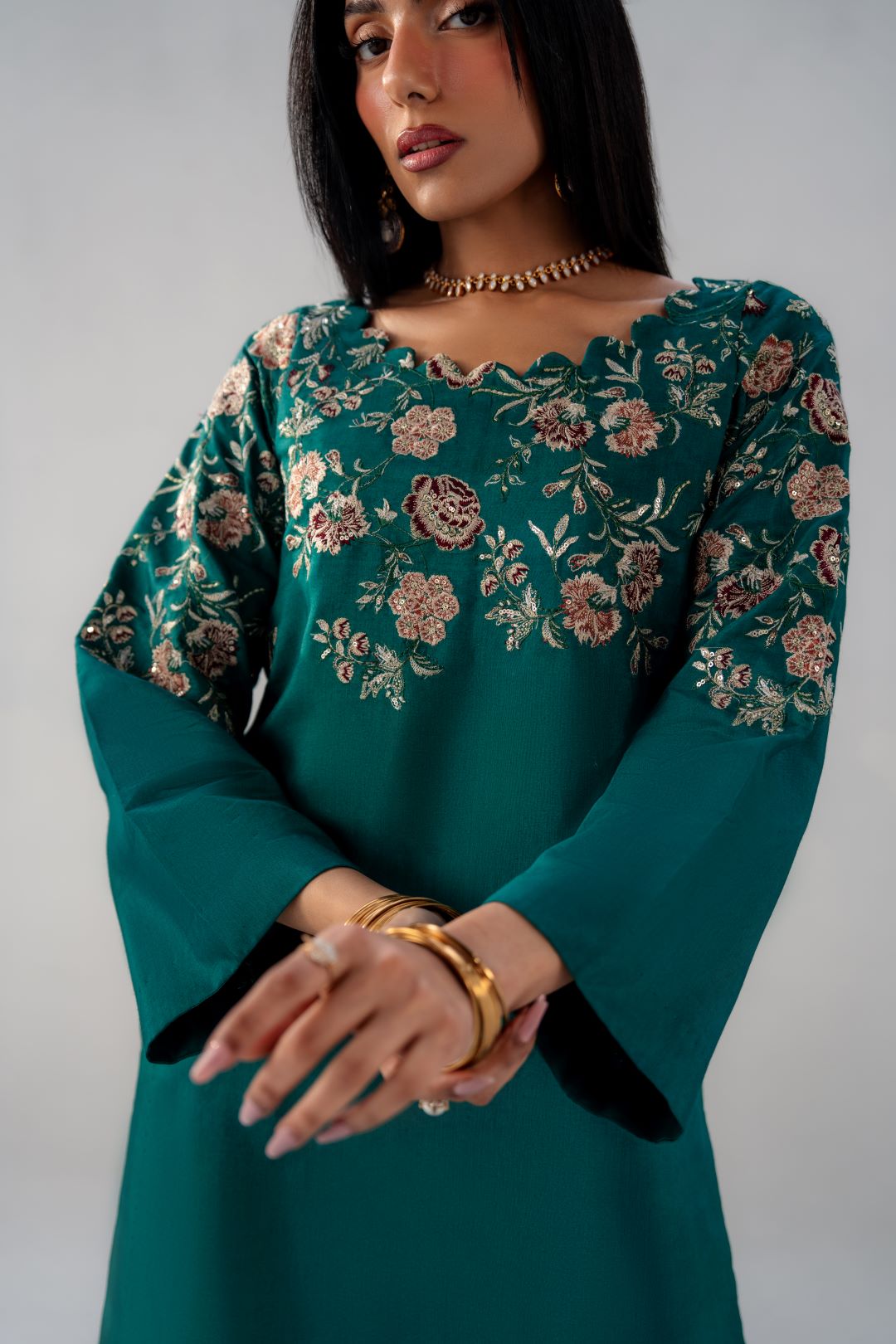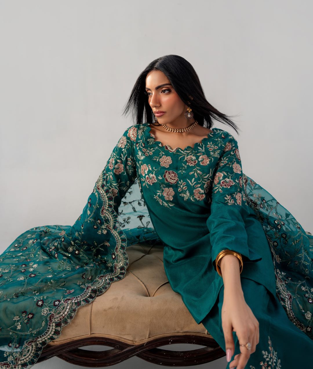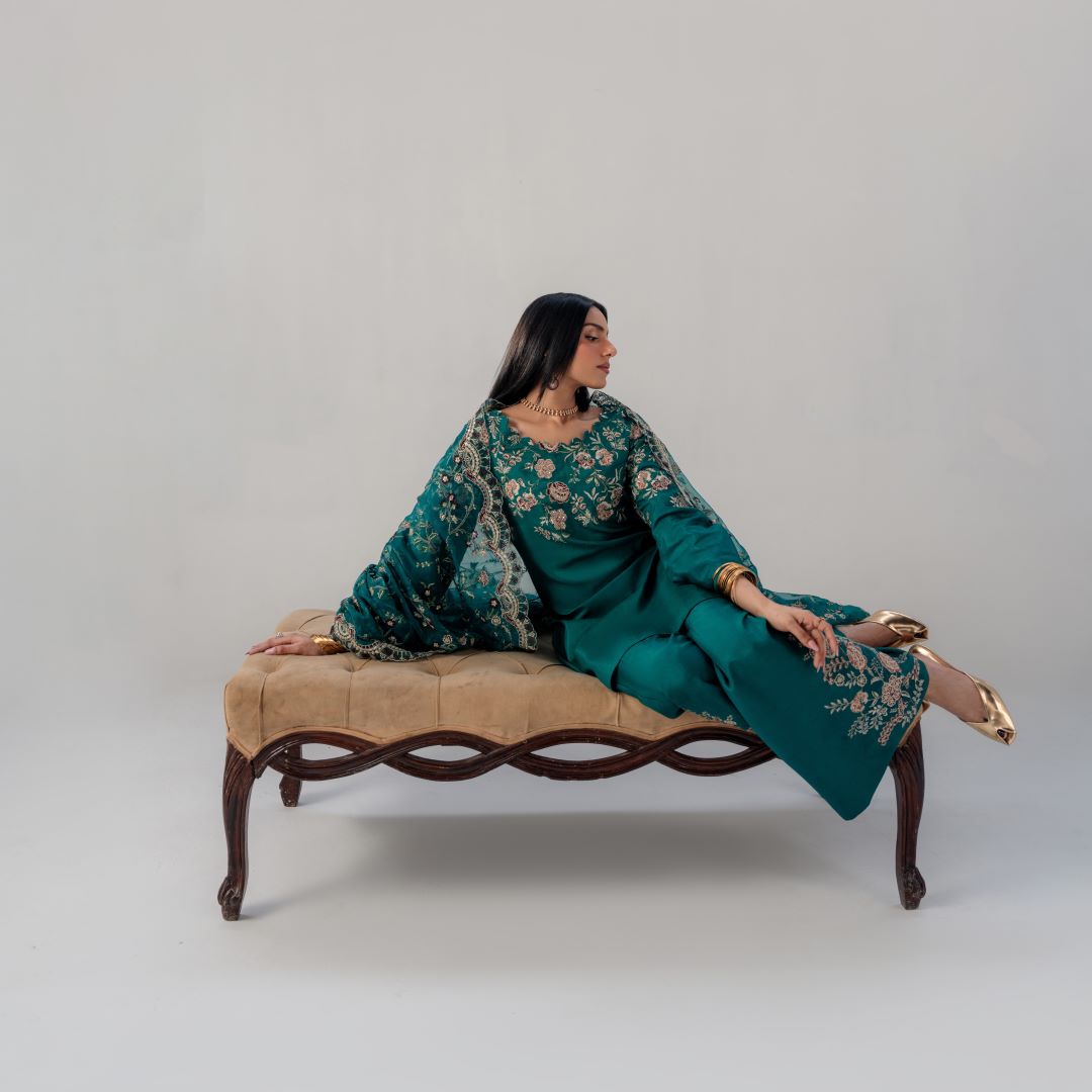 Zarqa is a timeless deep emerald green ensemble crafted for refined festive dressing. Designed in premium silk and enhanced with delicate floral embroidery, this outfit embodies understated luxury. Paired with a graceful silk pant and an embroidered organza dupatta featuring scalloped detailing, it adds effortless movement and elegance while creating a modern yet traditional silhouette. Perfect for Eid gatherings, formal dinners, and festive celebrations.