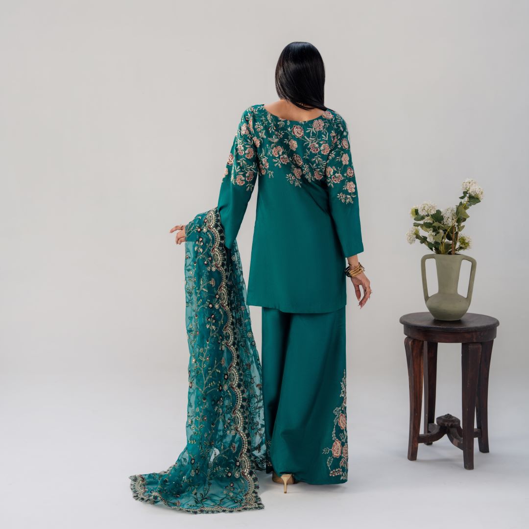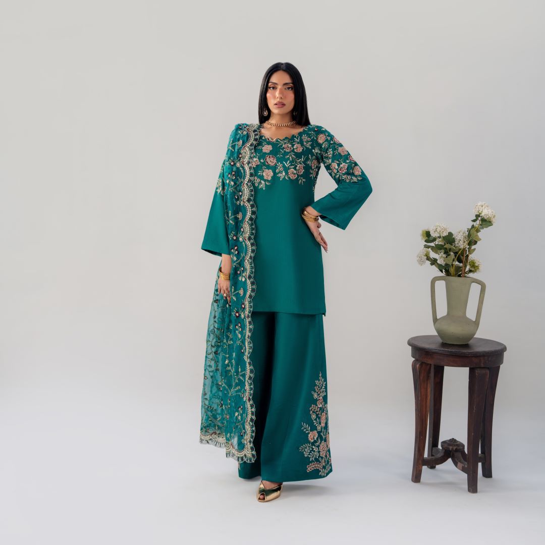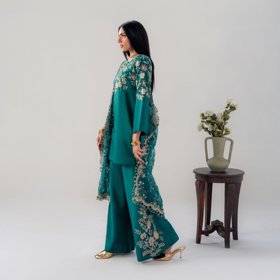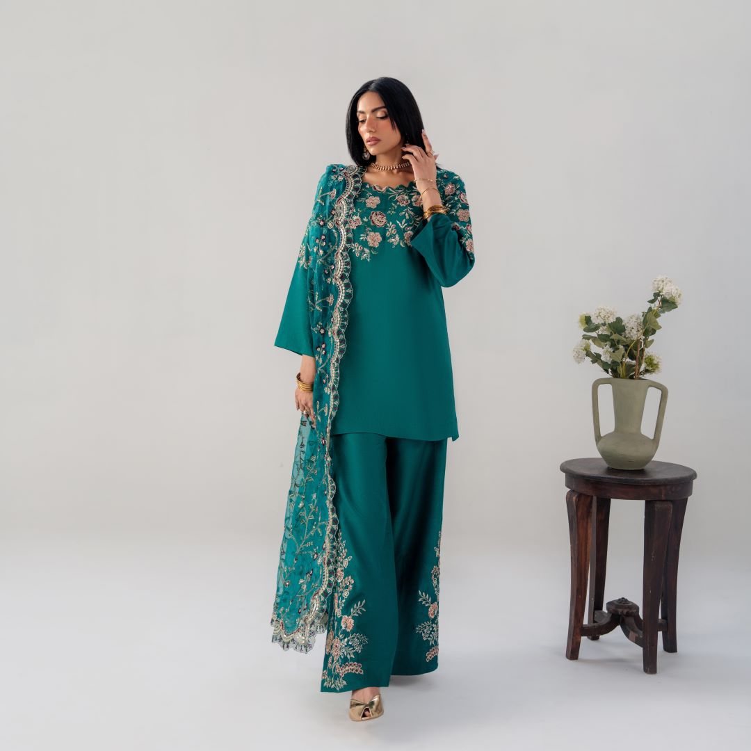 Zarqa is a timeless deep emerald green ensemble crafted for refined festive dressing. Designed in premium silk and enhanced with delicate floral embroidery, this outfit embodies understated luxury. Paired with a graceful silk pant and an embroidered organza dupatta featuring scalloped detailing, it adds effortless movement and elegance while creating a modern yet traditional silhouette. Perfect for Eid gatherings, formal dinners, and festive celebrations.