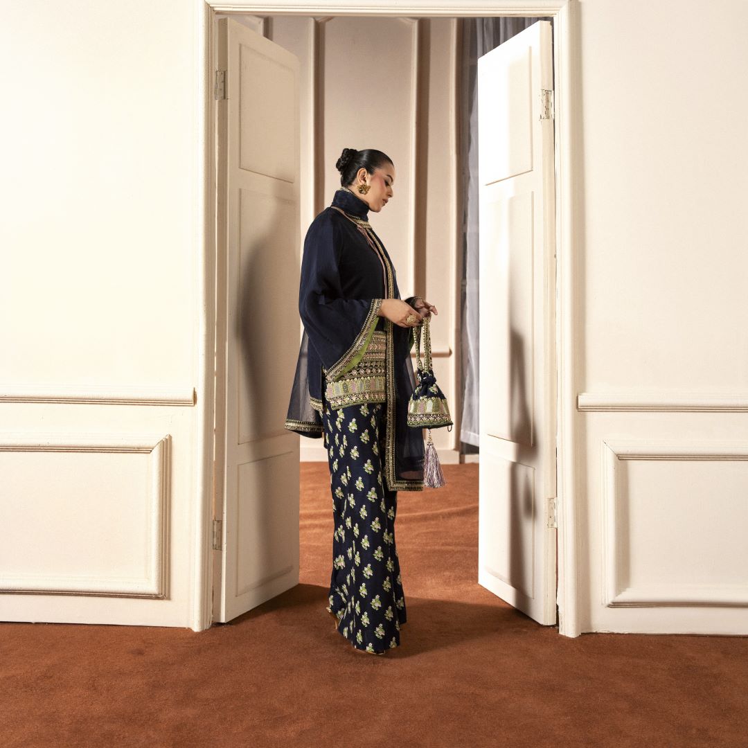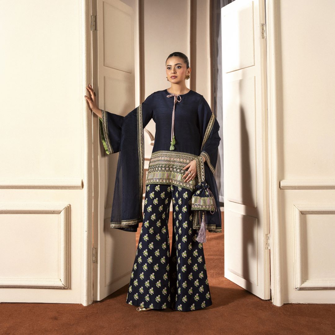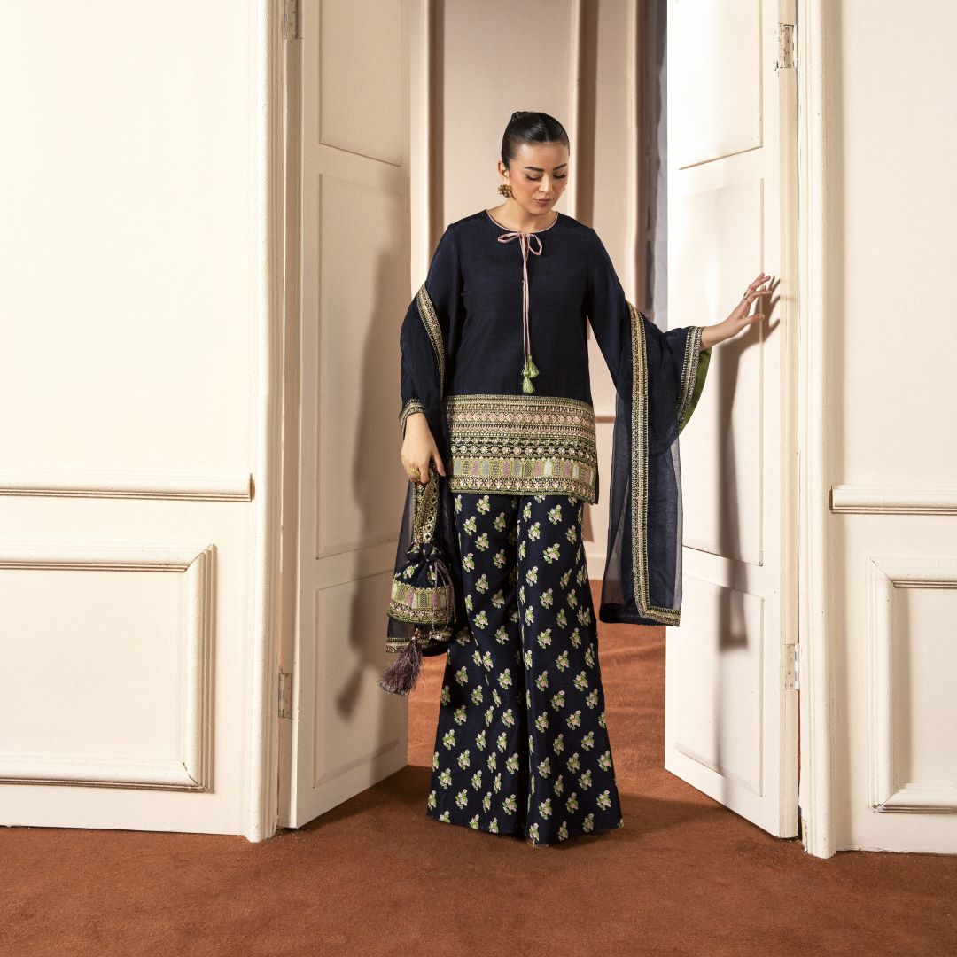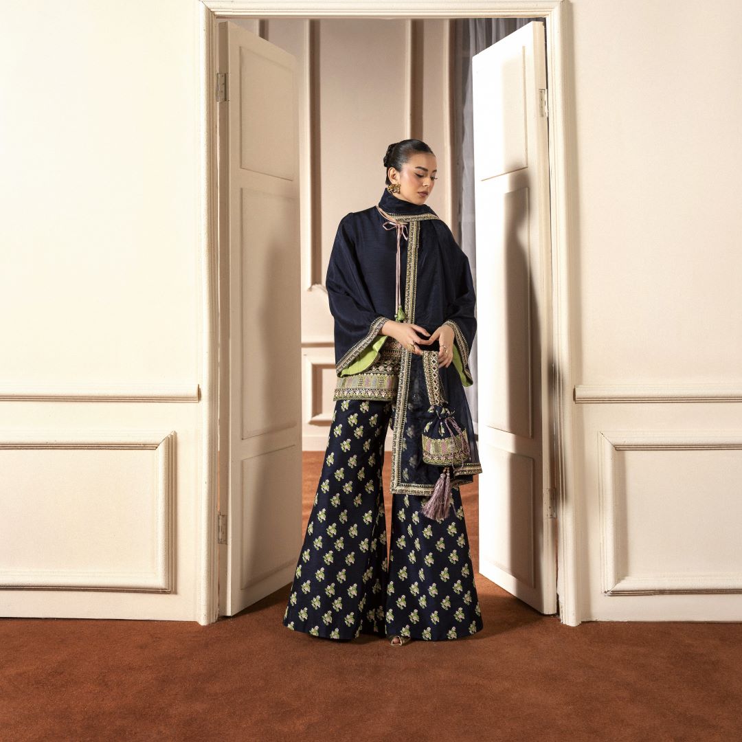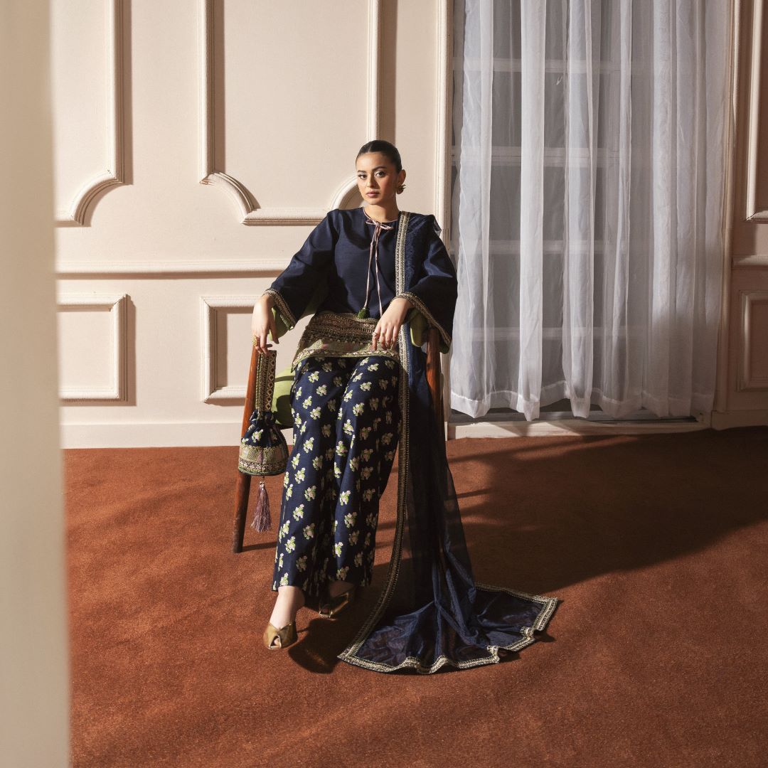 Zarqash is a statement of elevated festive luxury. Crafted in premium Korean raw silk and enriched with intricate embroidery and refined embellishments, this ensemble embodies power and poise. The block-printed Korean raw silk pants add depth and character, while the flowing organza dupatta brings movement and drama to the silhouette.